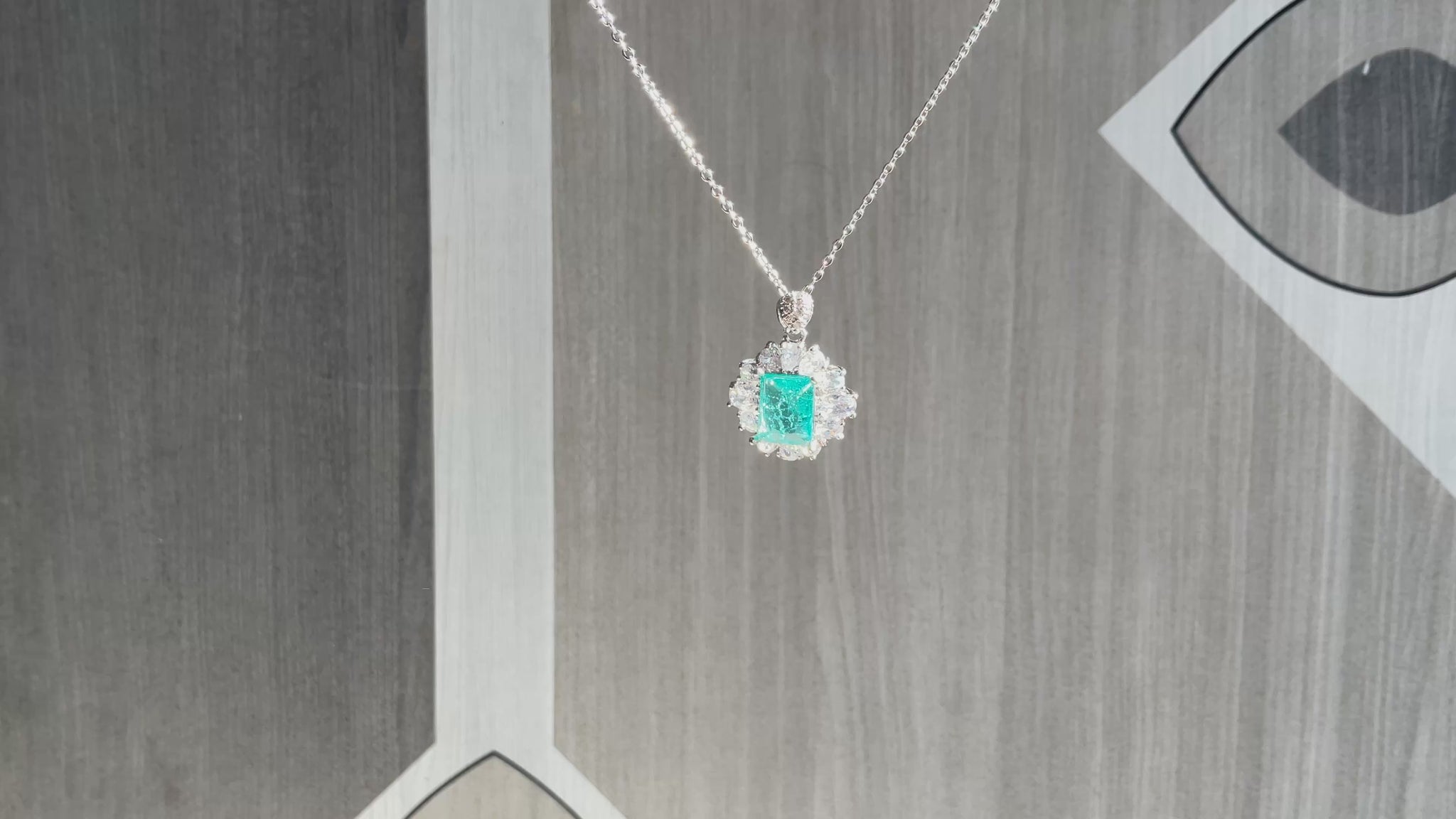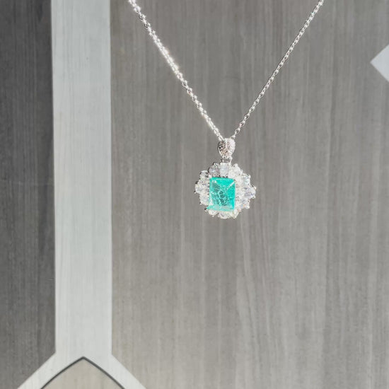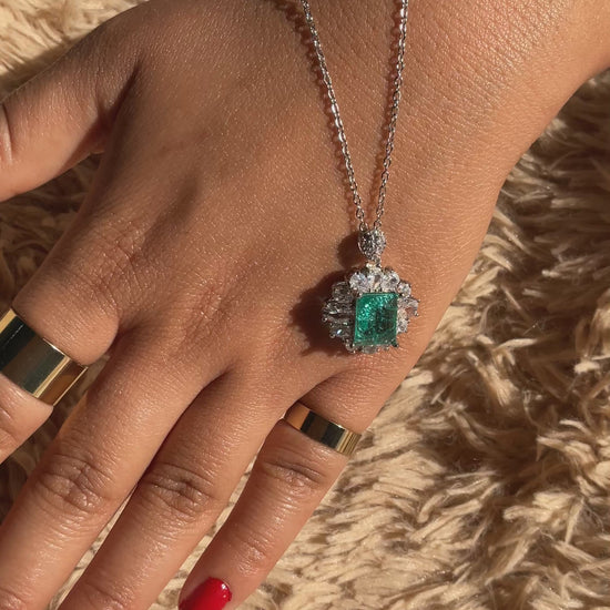 Experience the allure of deep forest greens and brilliant light. This exquisite pendant features a striking radiant-cut emerald-green stone, framed by a meticulously crafted halo of shimmering crystals that amplify its natural glow.